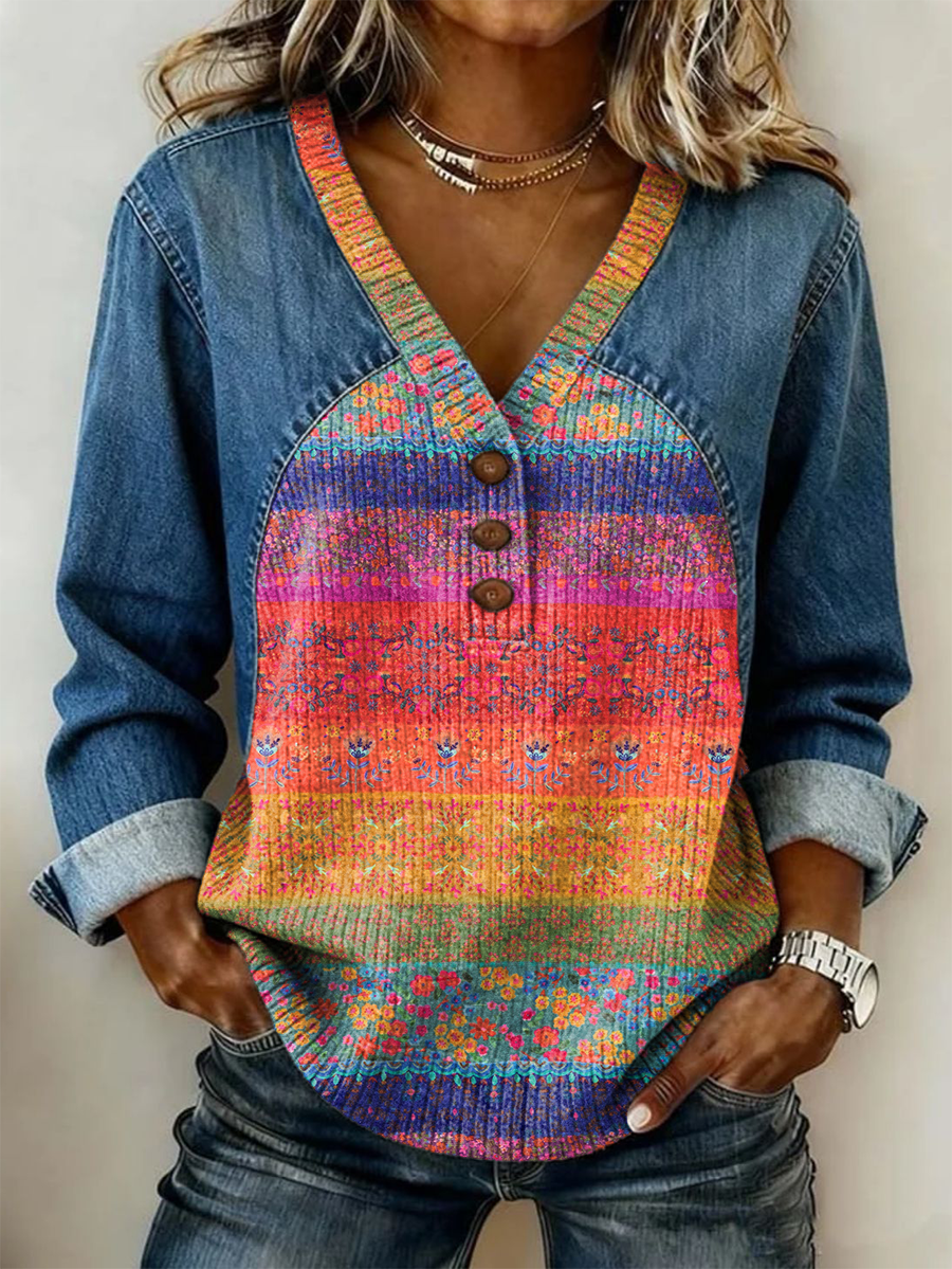 Women's Retro Colorful Floral Striped Art Print Casual Long Sleeve V-Neck Washed Cotton Denim and Knitwear Combination T-Shirt