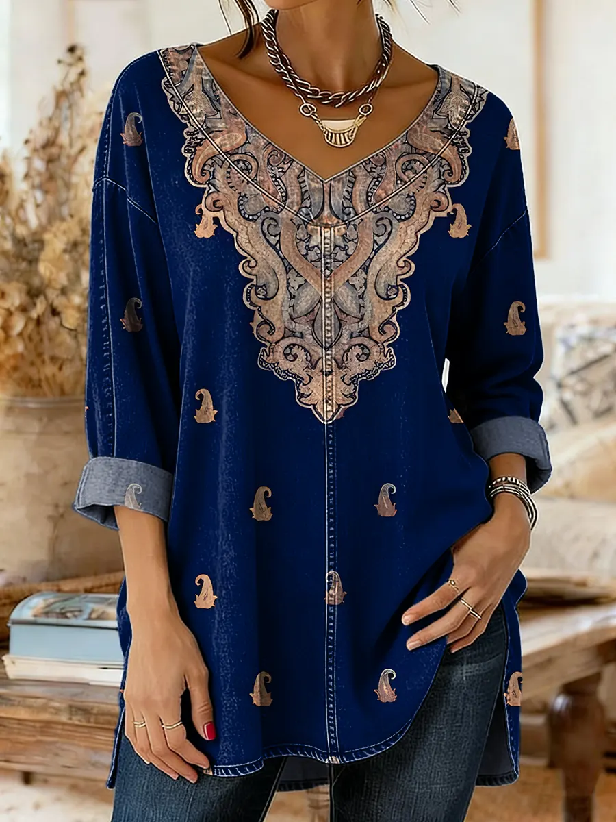 Ethnicity Geometry Totem Paisley Women's Art Print Casual Washed Denim Cotton Top
