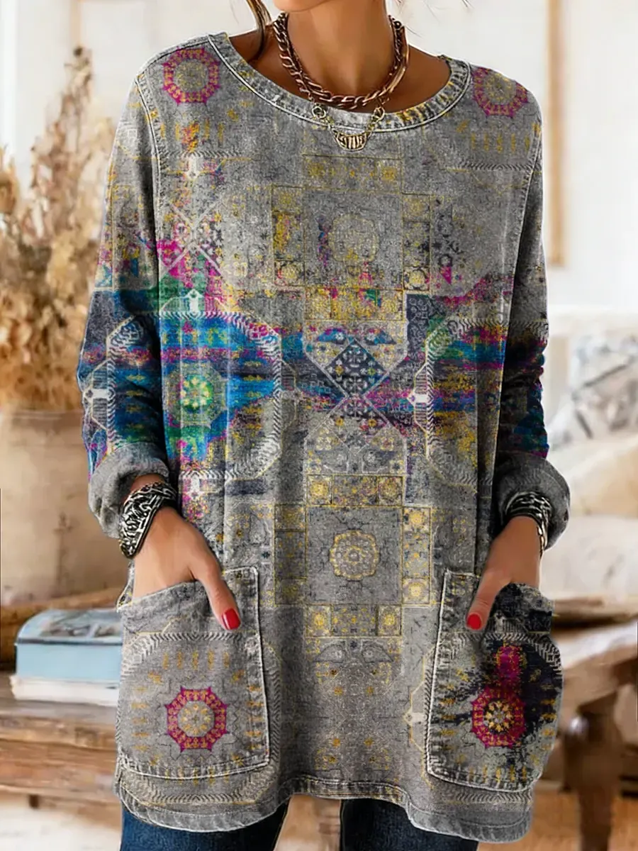 Ethnicity Geometry Totem Women's Casual Long-sleeve Crew Neck Pocket Washed Cotton Denim T-shirt