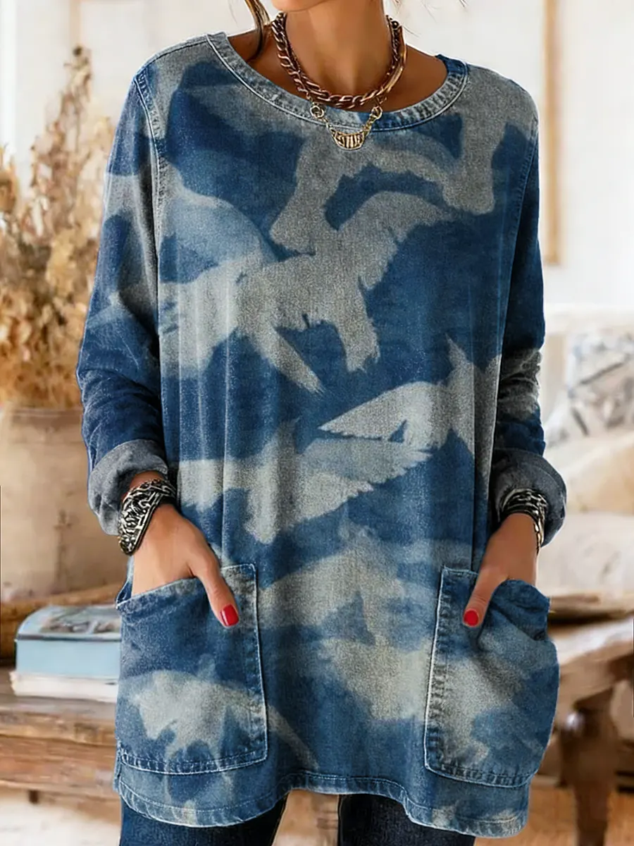 Ethnicity Tie Dye Bird Women's Casual Long-sleeve Crew Neck Pocket Washed Cotton Denim T-shirt