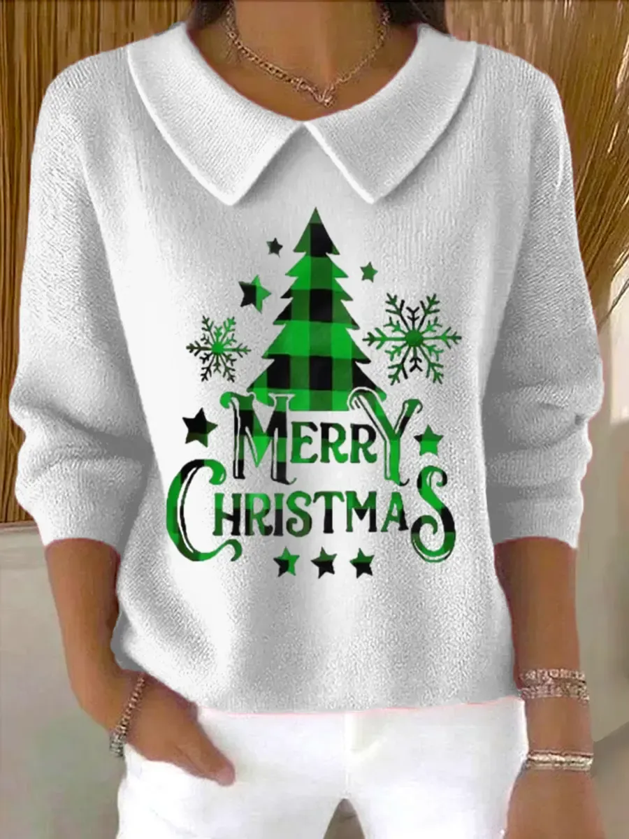 Vintage Christmas Art Print Casual Peter Pan Collar 3/4 Sleeve Sweat
