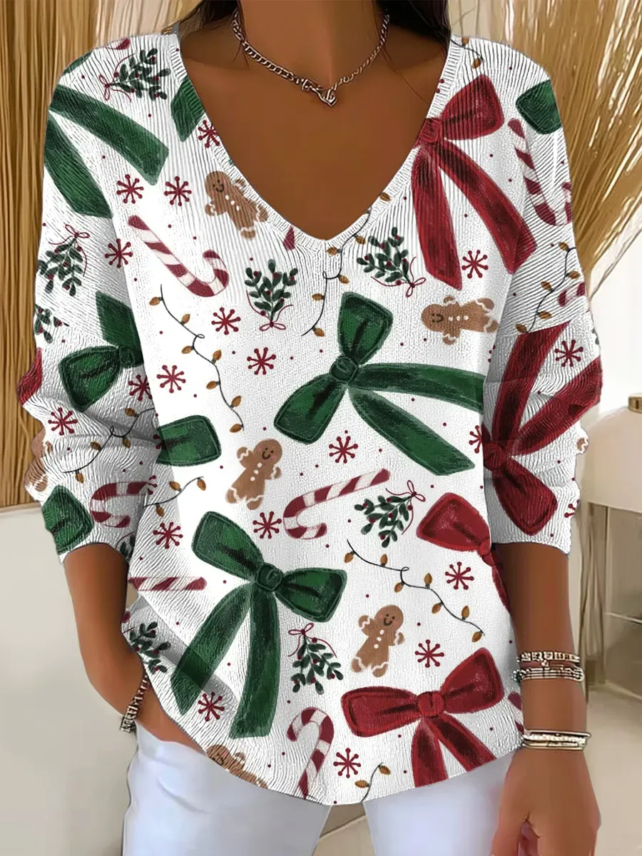 Vintage Christmas Bow Art Print Casual V-Neck Pullover Sweater