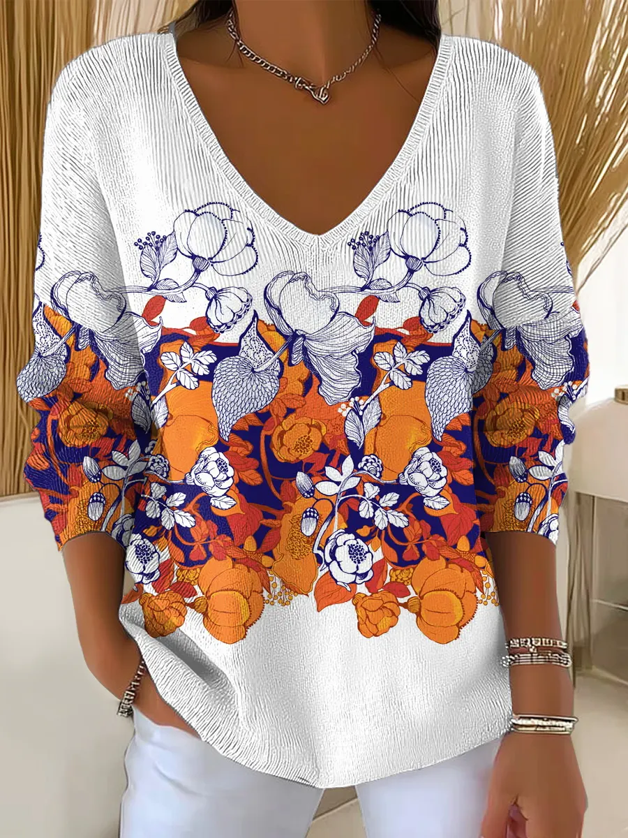 Vintage Floral Art Print Casual V-Neck Pullover Sweater