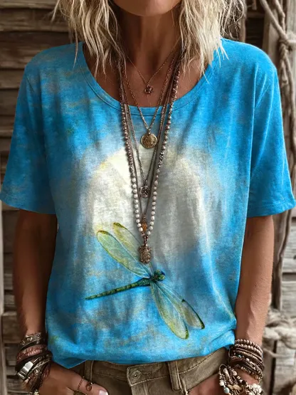 Women's Blue Moon Dragonfly Art Print Casual Crew Neck Short Sleeve Cotton T-shirt