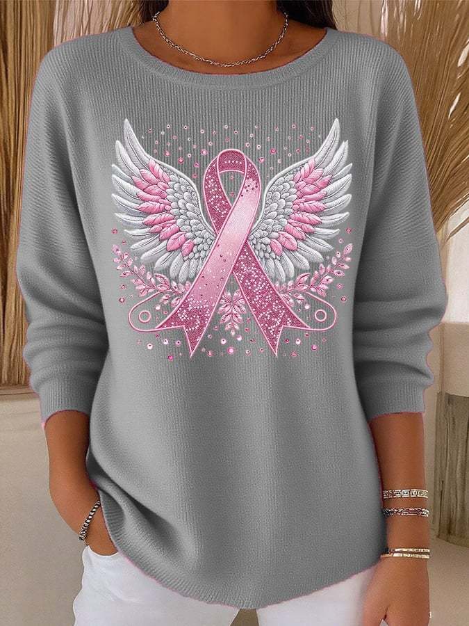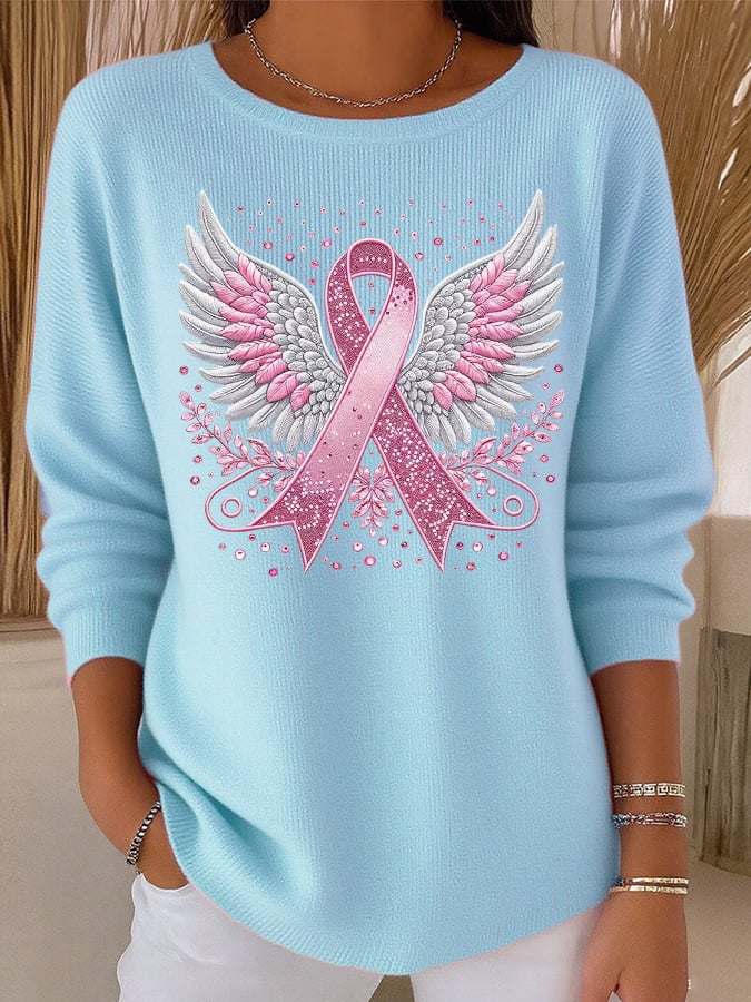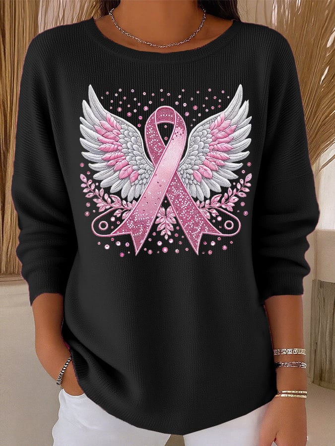 Women's Casual Breast Cancer Pink Ribbon Wings Knit Top