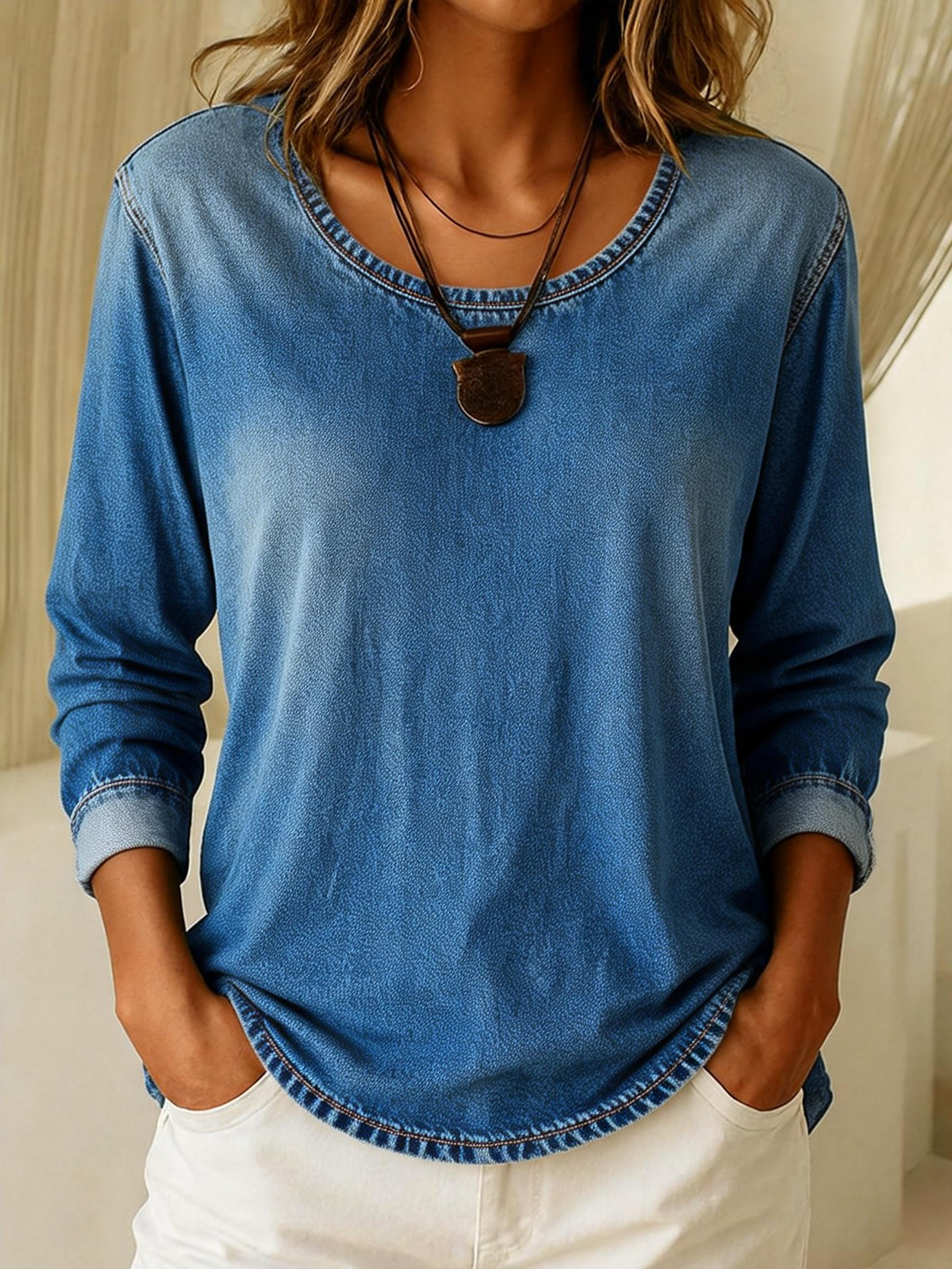 Women's Casual Long-sleeved Crew Neck Washed Cotton Denim T-shirt