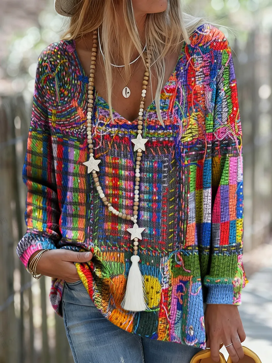 Women's Colorful Woven Textured Art Pattern Print V-neck Long-sleeve Knit Sweater