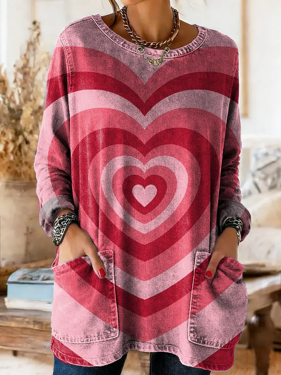 Women's Heart Pattern Art Print Casual Long-sleeve Crew Neck Pocket Cotton Denim T-shirt