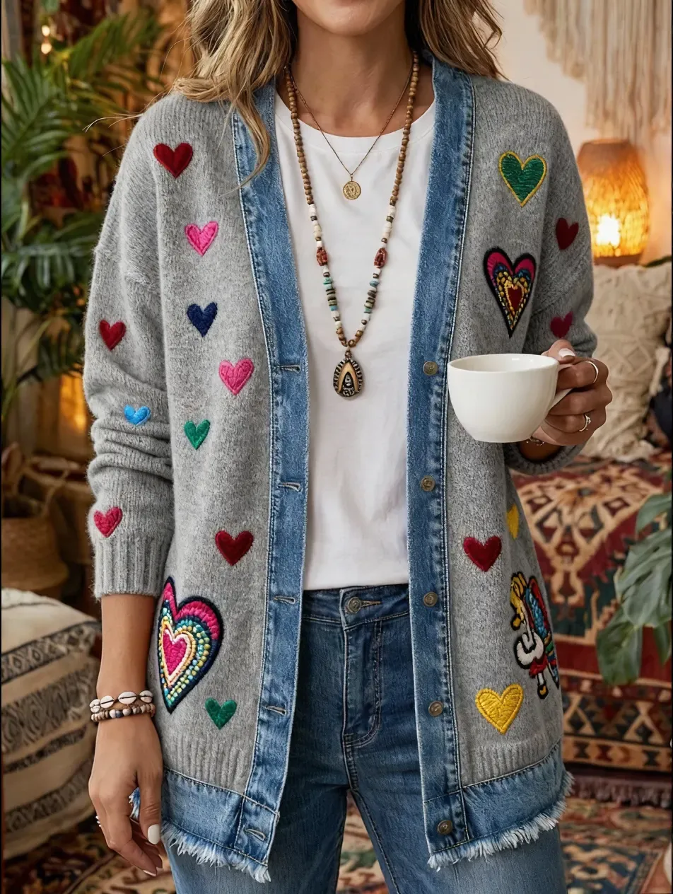 Women's Hippie-style Colorful Heart-shaped Art Print Casual Long-sleeved Sweater Paired With A Denim Patchwork Jacket.