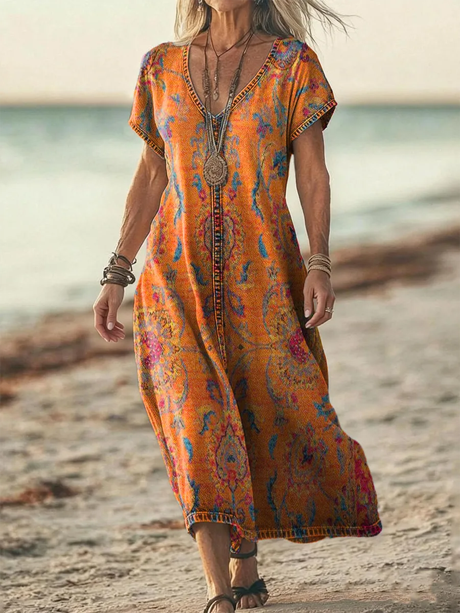Women's Retro Ethnic Art Print Casual Short-Sleeve V-Neck Washed Cotton Denim Dress