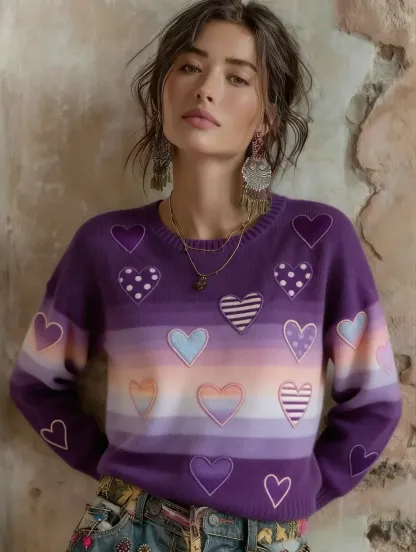 Women's Retro-style Hippie Gradient Heart-shaped Art Print Casual Crew Neck Sweater