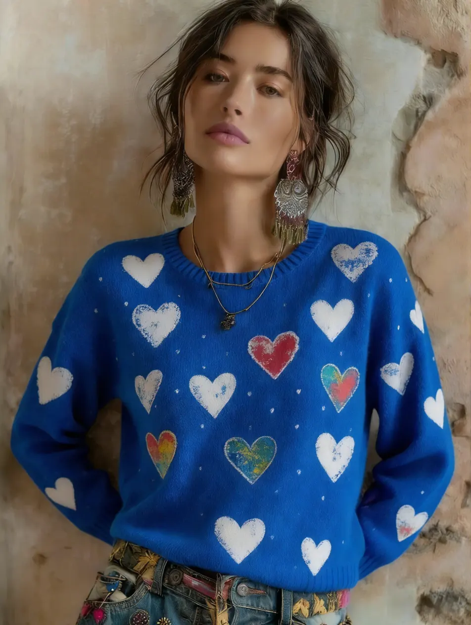 Women's Retro-style Hippie Heart Art Print Casual Crew Neck Sweater