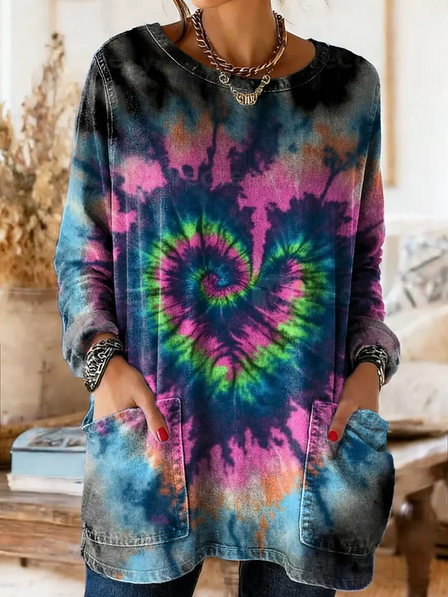 Women's Tie-dye Heart Pattern Art Print Casual Long-sleeve Crew Neck Pocket Cotton Denim T-shirt
