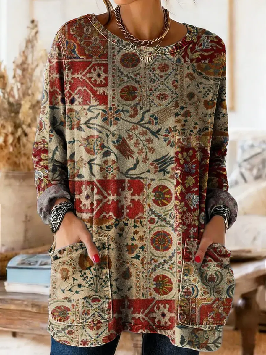 Women's Vintage Ethnic Floral Art Print Casual Long-sleeve Crew Neck Pocket Cotton Denim T-shirt