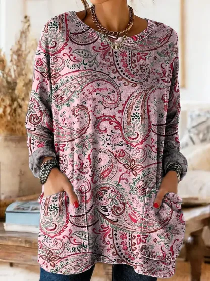 Women's Vintage Ethnic Floral Art Print Casual Long-sleeve Crew Neck Pocket Cotton Denim T-shirt