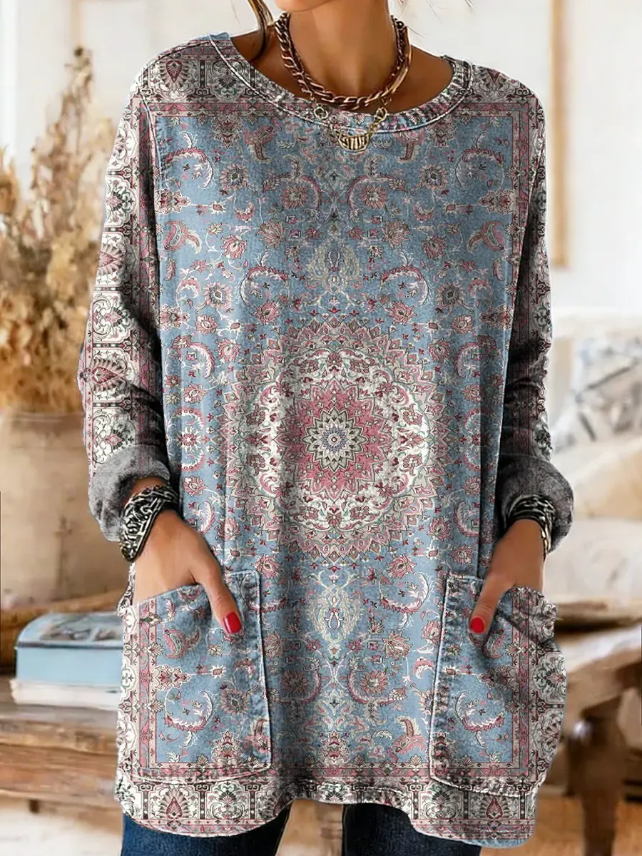 Women's Vintage Ethnic Floral Art Print Casual Long-sleeve Crew Neck Pocket Cotton Denim T-shirt