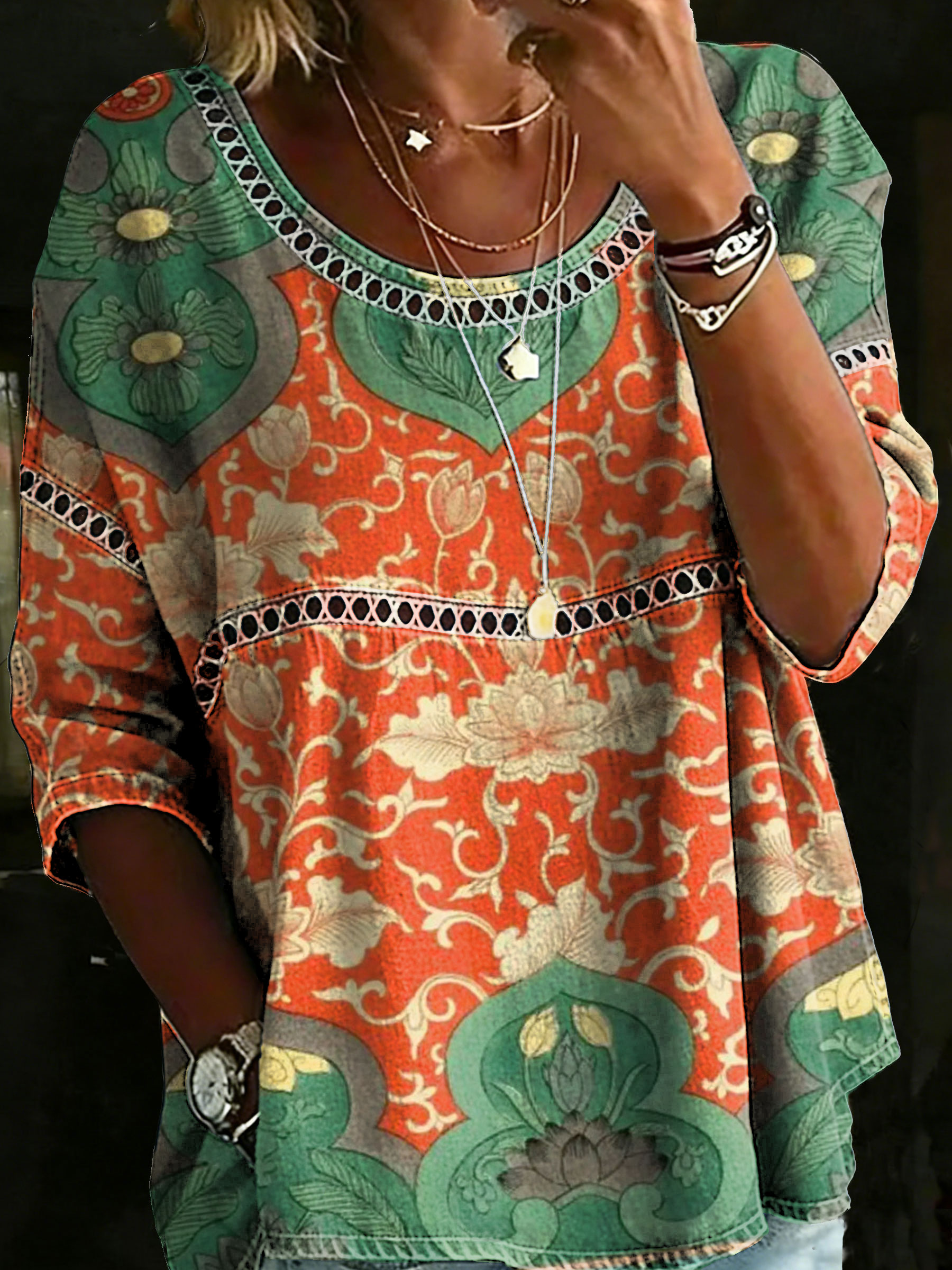 Women's Retro Ethnic Floral Art Print Casual Three-quarter Sleeve Round Neck Hollow-out Top