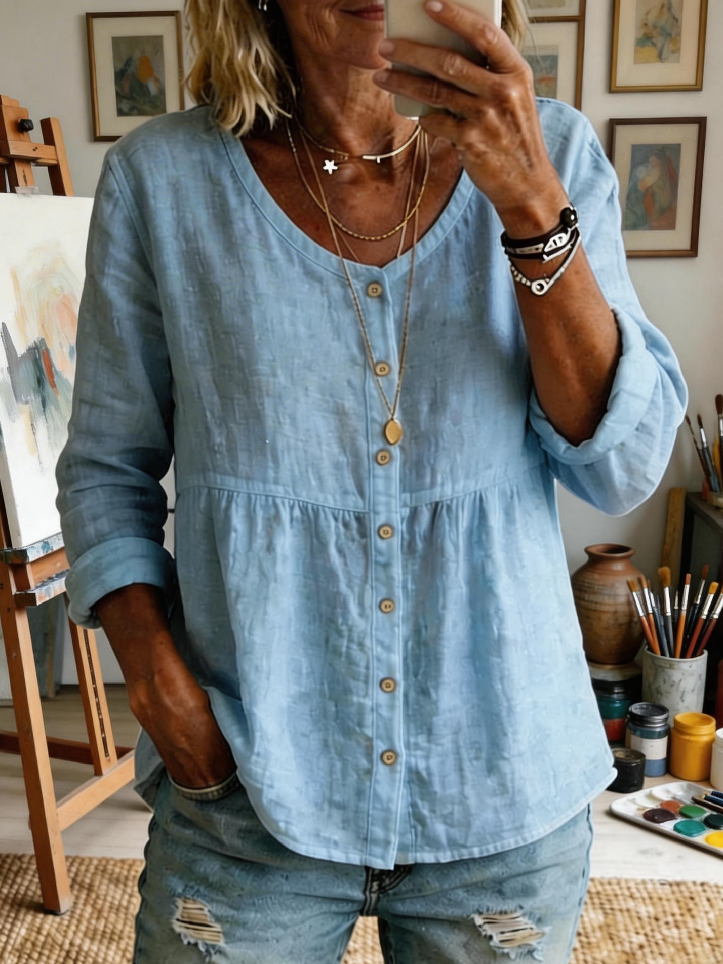 Women's Comfortable Casual V-neck Cotton Denim Top-1