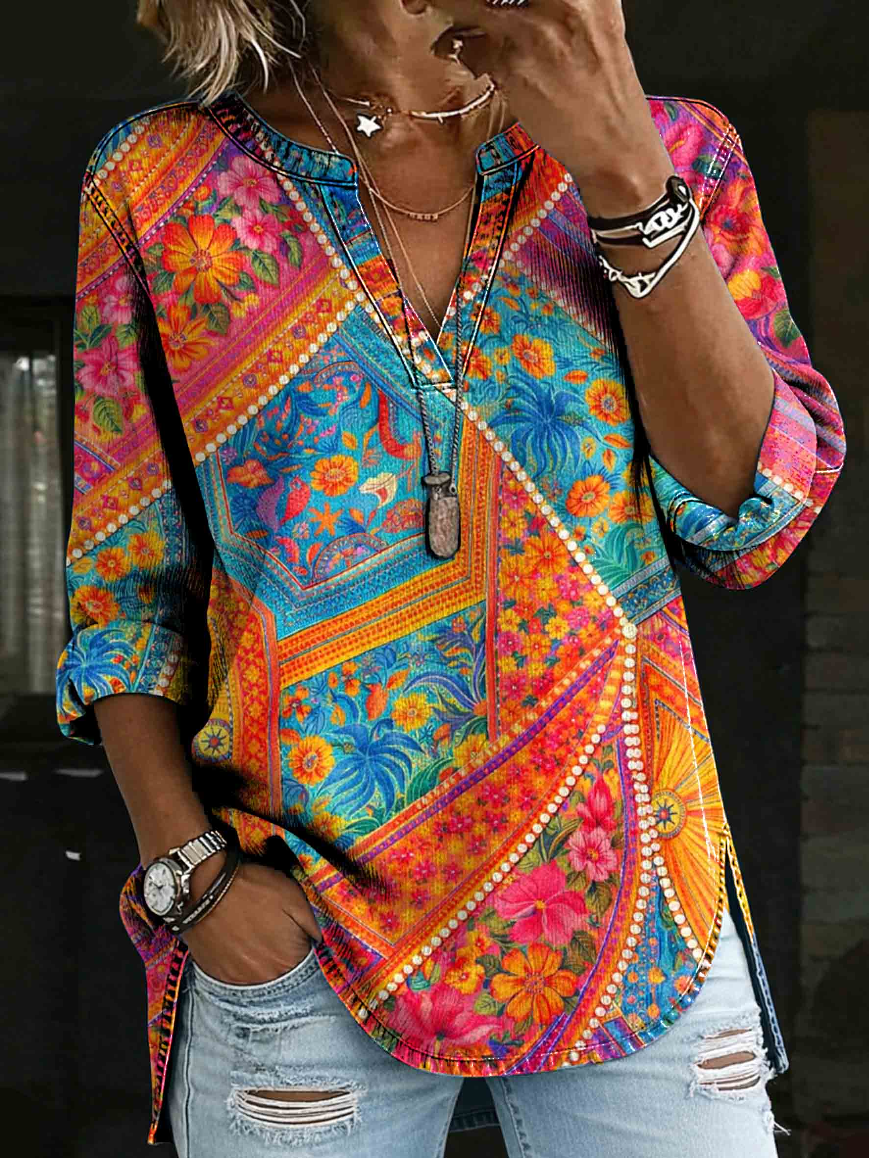 Women's Retro Colorful Floral Patchwork Art Print Denim V-neck Henley Long-sleeved Shirt
