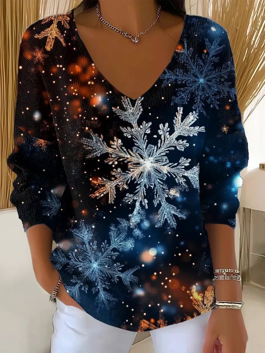 Vintage Snow Art Print Casual V-Neck Pullover Sweater
