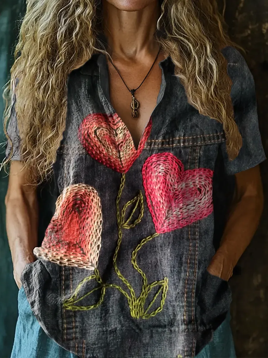 Women's Artistic Print V-neck Shirt With Heart Pattern And Sleeves