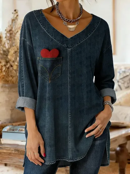 Women's Artistic Print Washed Denim Cotton Top With Heart-shaped Pattern
