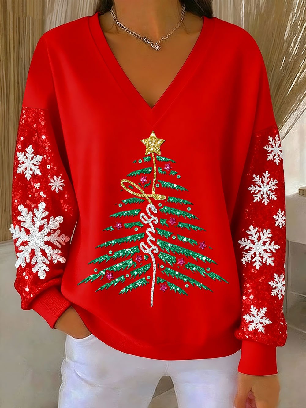 Women's Christmas Faith Print V-Neck Sweatshirt