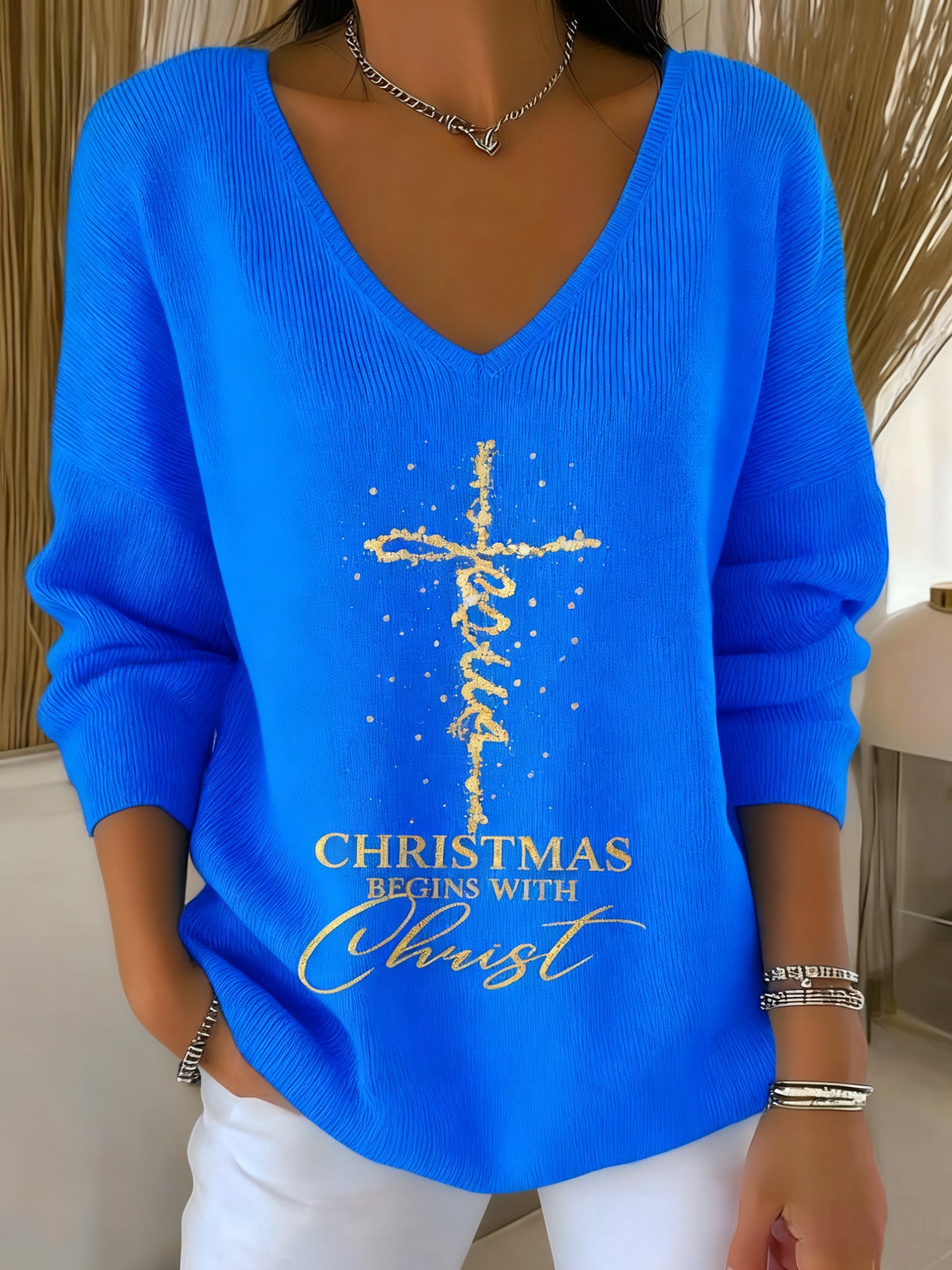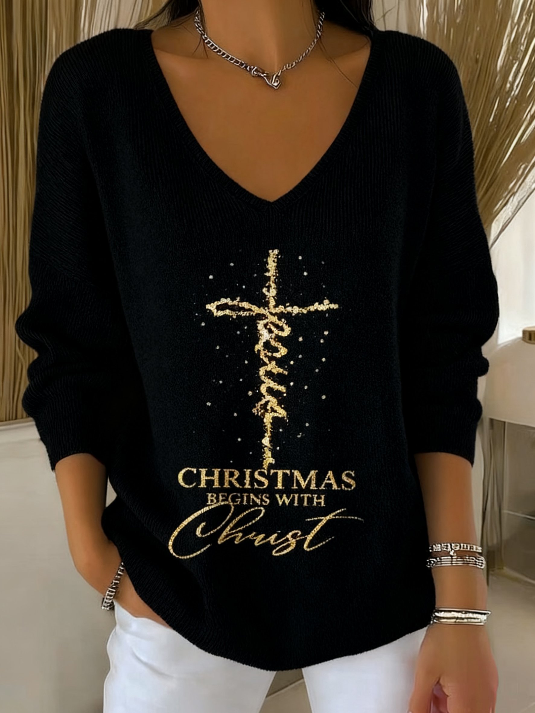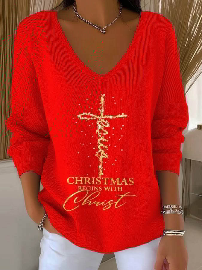 Women's Faith Christmas Christ Print V Neck Sweater