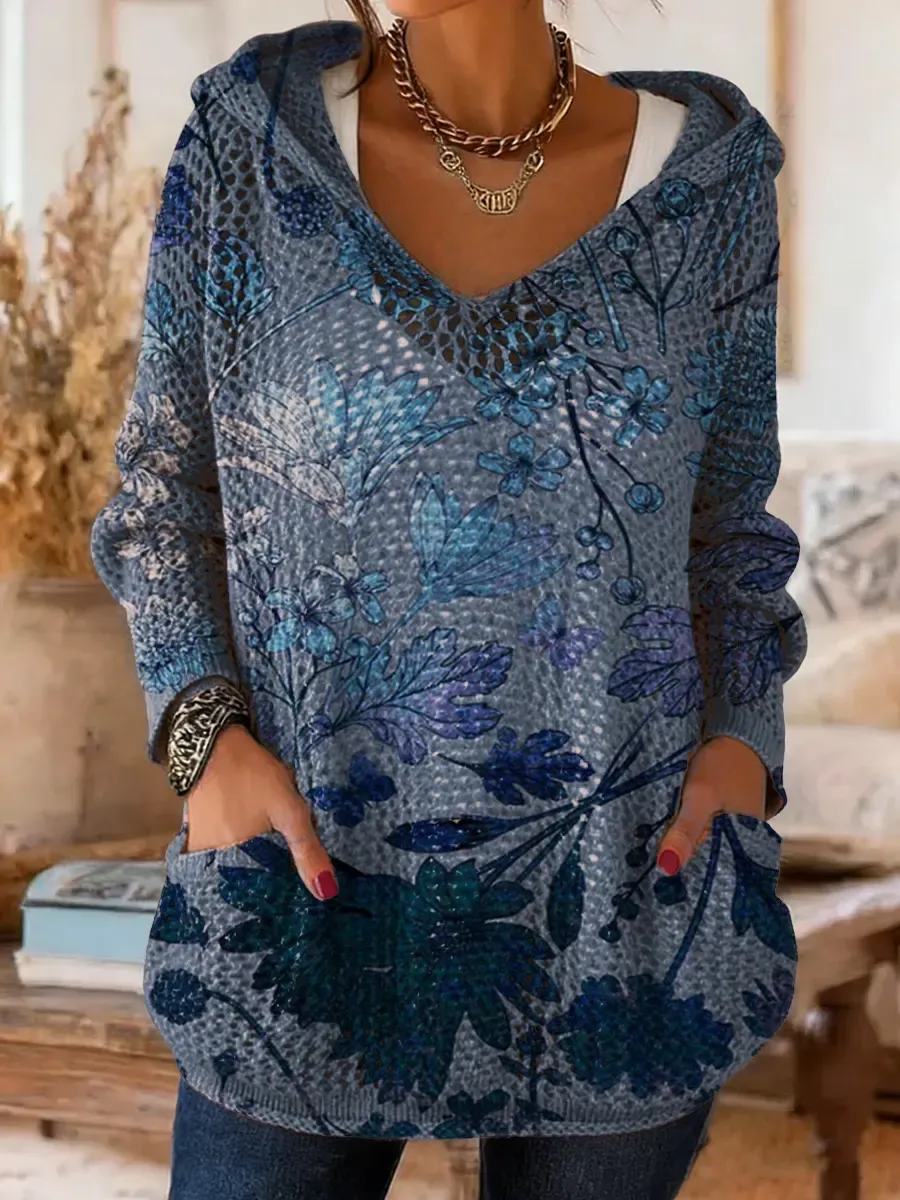 Women's Floral Art Print Long-Sleeved Hooded Cover-Up