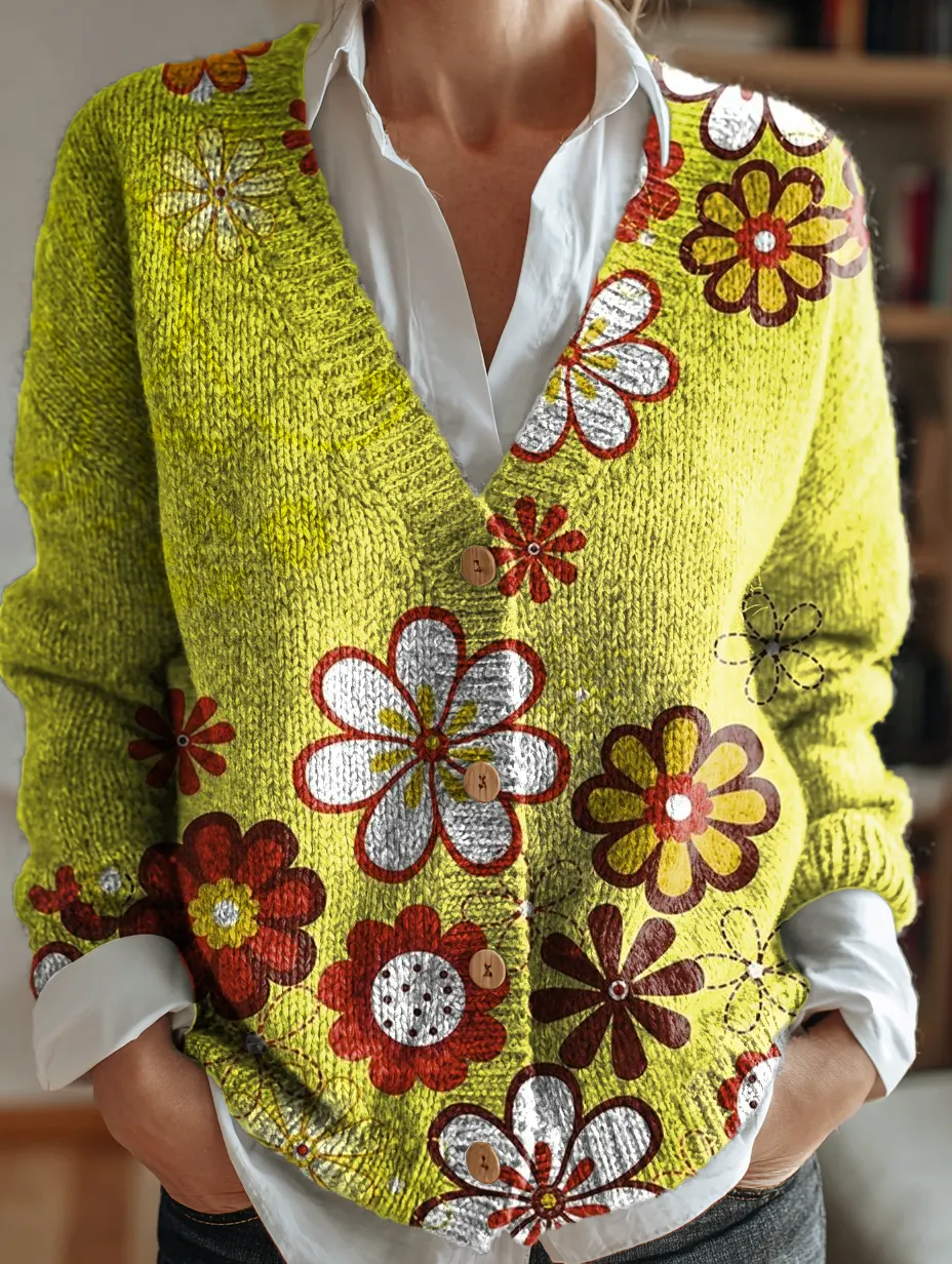 Women's Floral Petal Art Print Button-up V-neck Cardigan Sweater