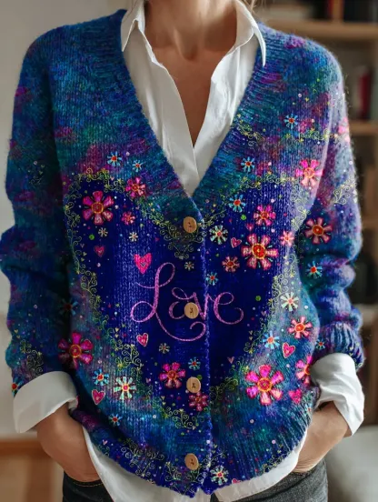 Women's Heart-shaped Floral Art Print Button-up V-neck Cardigan Sweater