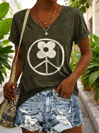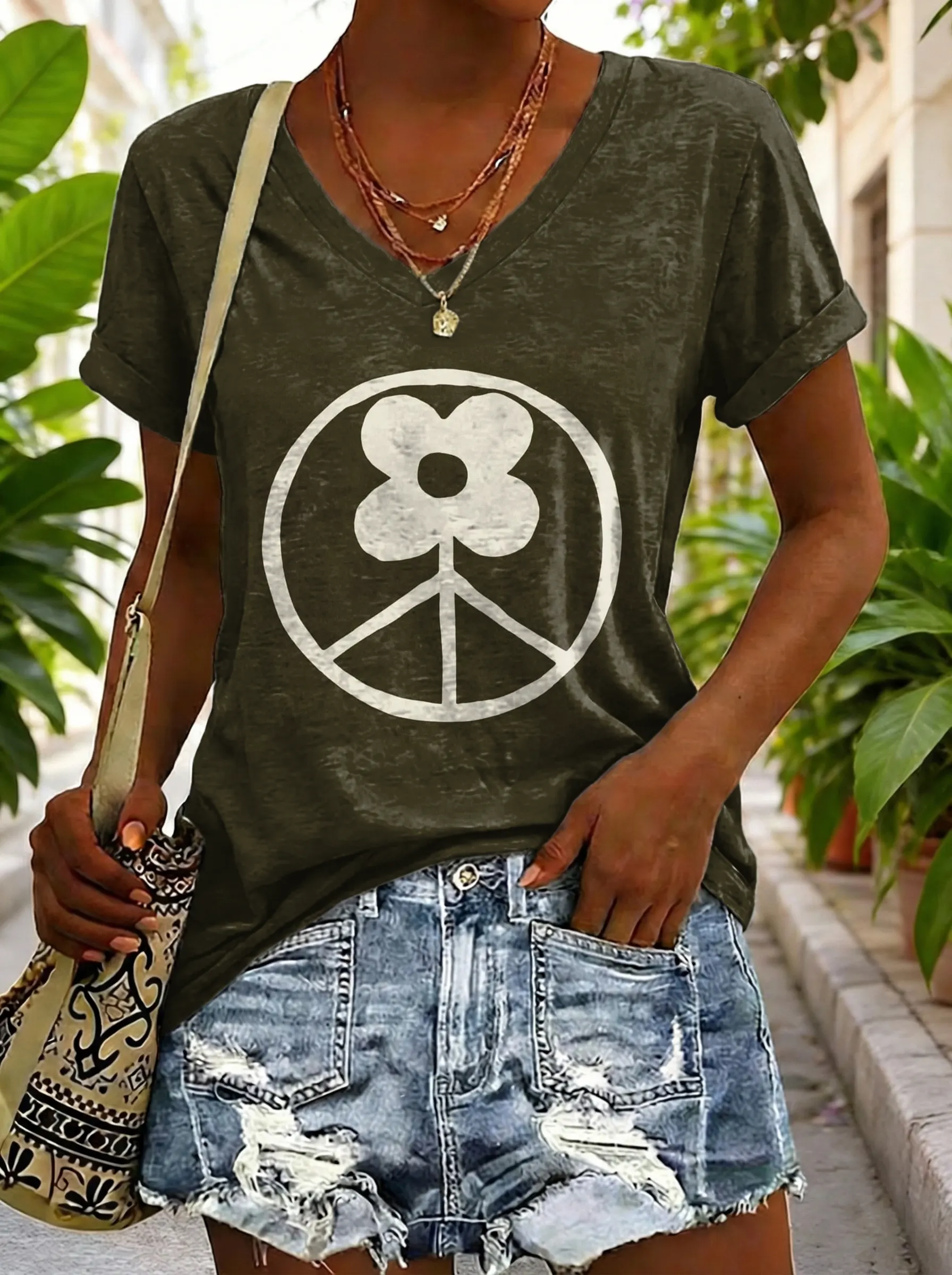 Women's Hippie Floral Art Print Casual V-neck Short-sleeved Cotton T-shirt