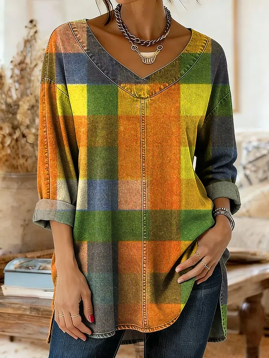 Women's Multicolor Plaid Art Print Washed Denim Cotton Top