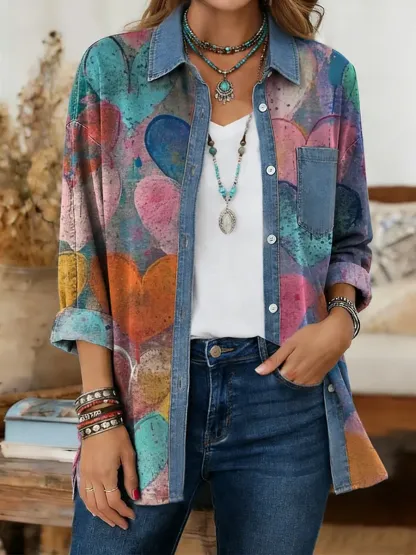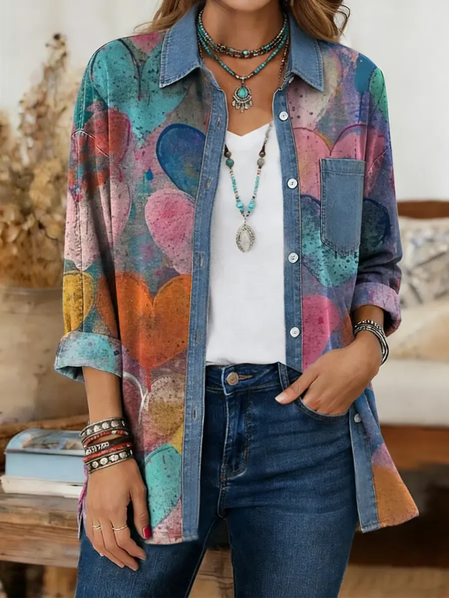 Women's Oil Painting Style Colorful Floral Art Print Casual Denim Patchwork Cotton Shirt