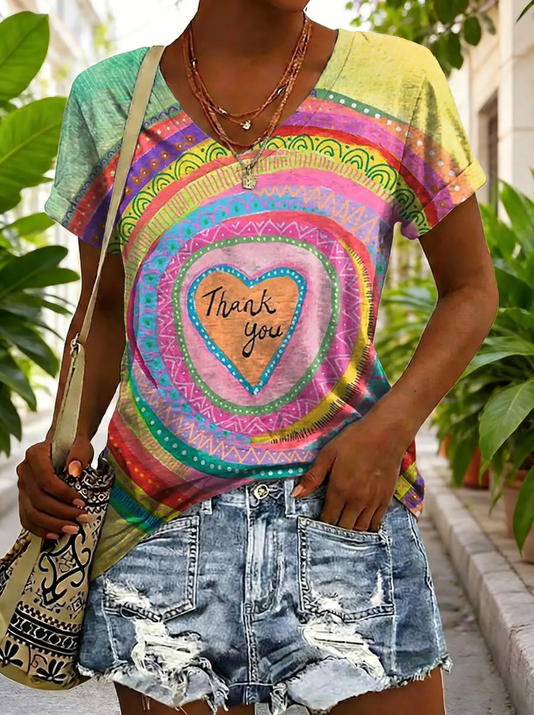 Women's Retro Colorful Heart Art Print Casual V-neck Short-sleeve Cotton T-shirt