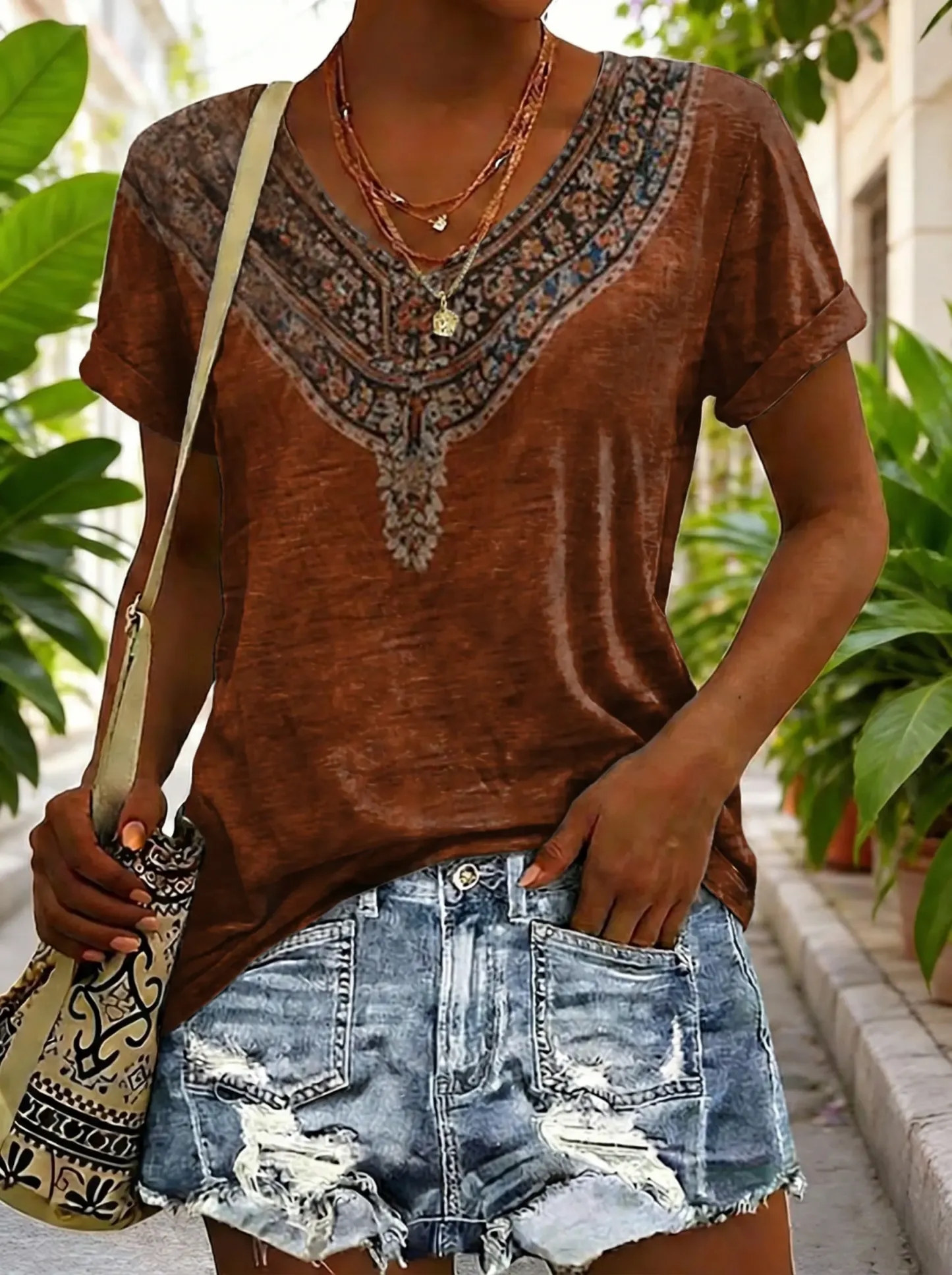 Women's Retro Ethnic Totem Art Print Casual V-neck Short-sleeved Cotton T-shirt