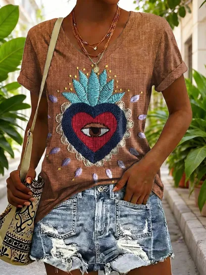 Women's Retro Hippie Heart Art Print Casual V-neck Short-sleeve Cotton T-shirt