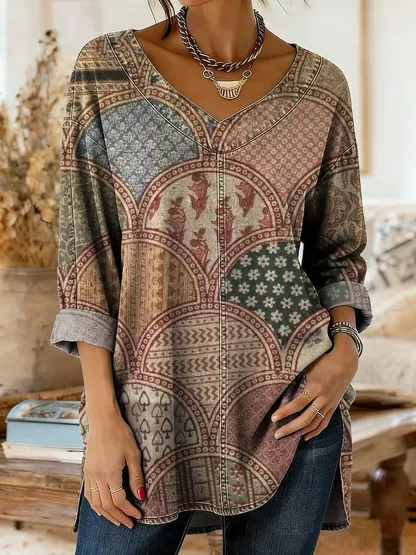 Women's Vintage Ethnic Floral Pattern Art Print Washed Denim Cotton Top