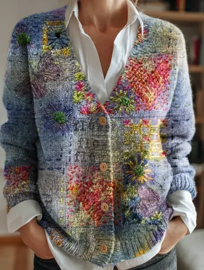 Women's Vintage Patchwork Art Print Button-up V-neck Cardigan Sweater