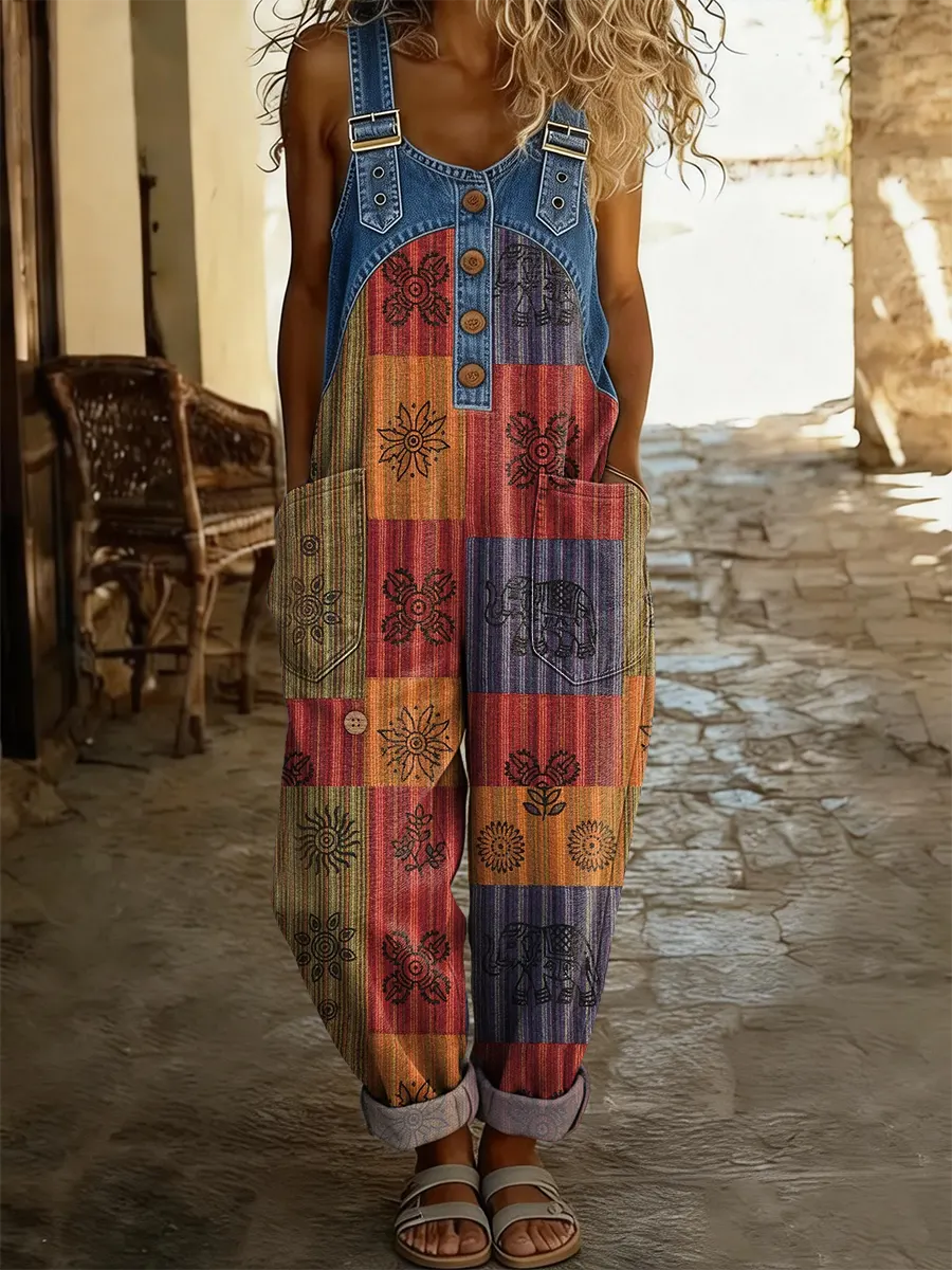 Ethnicity Floral Geometry Patchwork Women's Casual Washed Cotton Denim Patchwork Jumpsuit