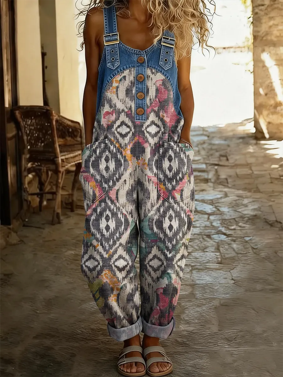 Ethnicity Totem Geometry Pattern Women's Casual Washed Cotton Denim Patchwork Jumpsuit
