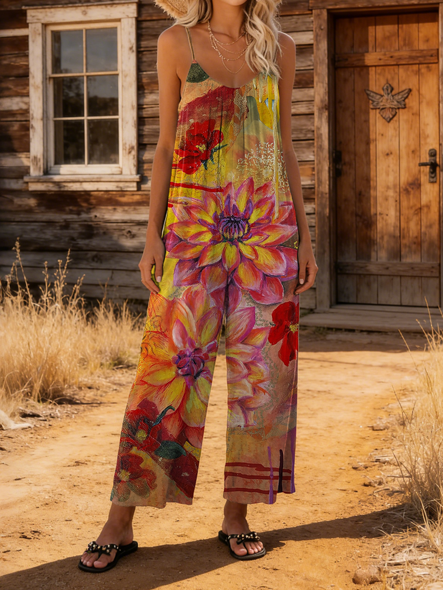 Women's Retro Colorful Floral Striped Art Print Casual Sleeveless Pocket Jumpsuit
