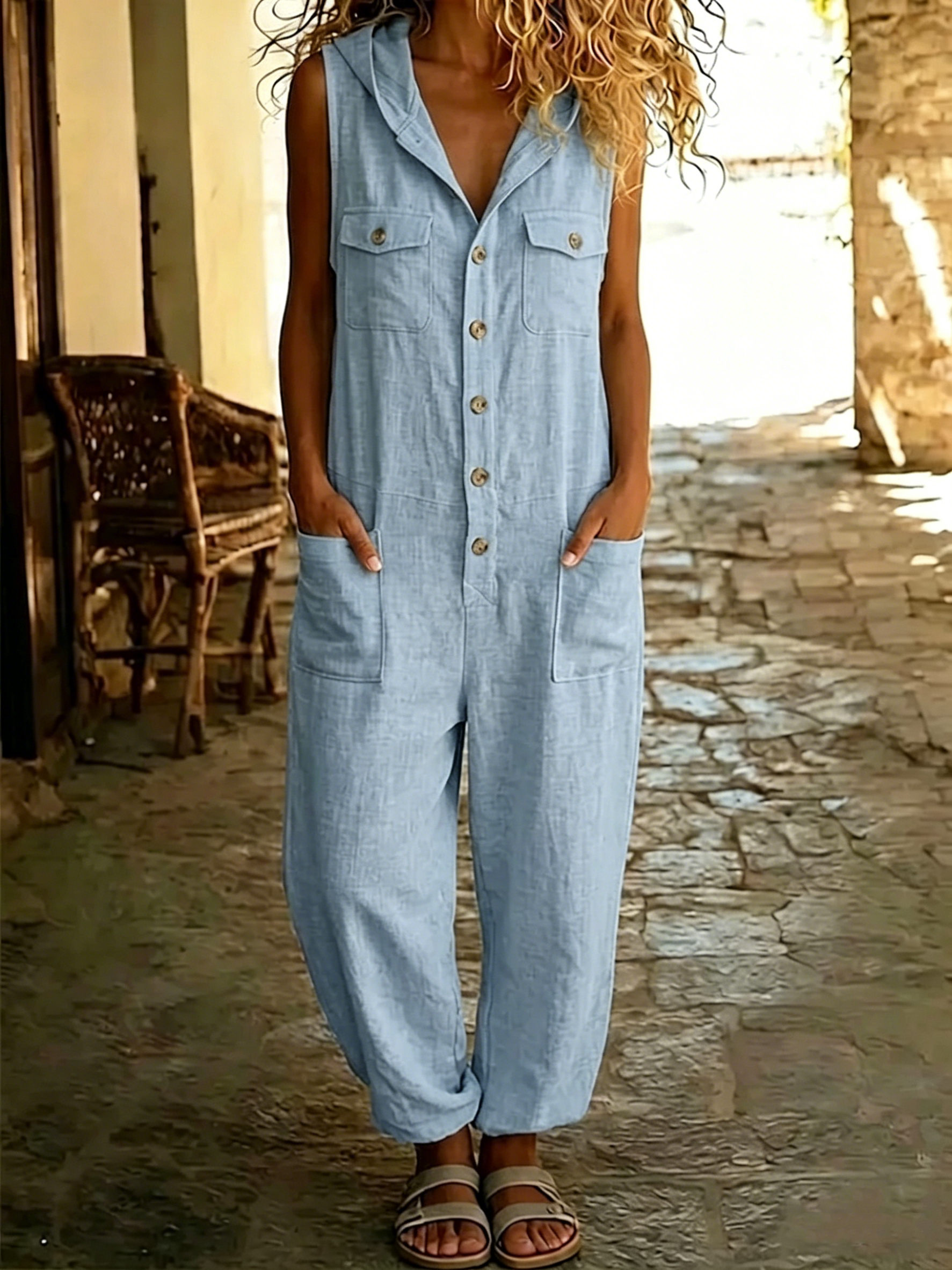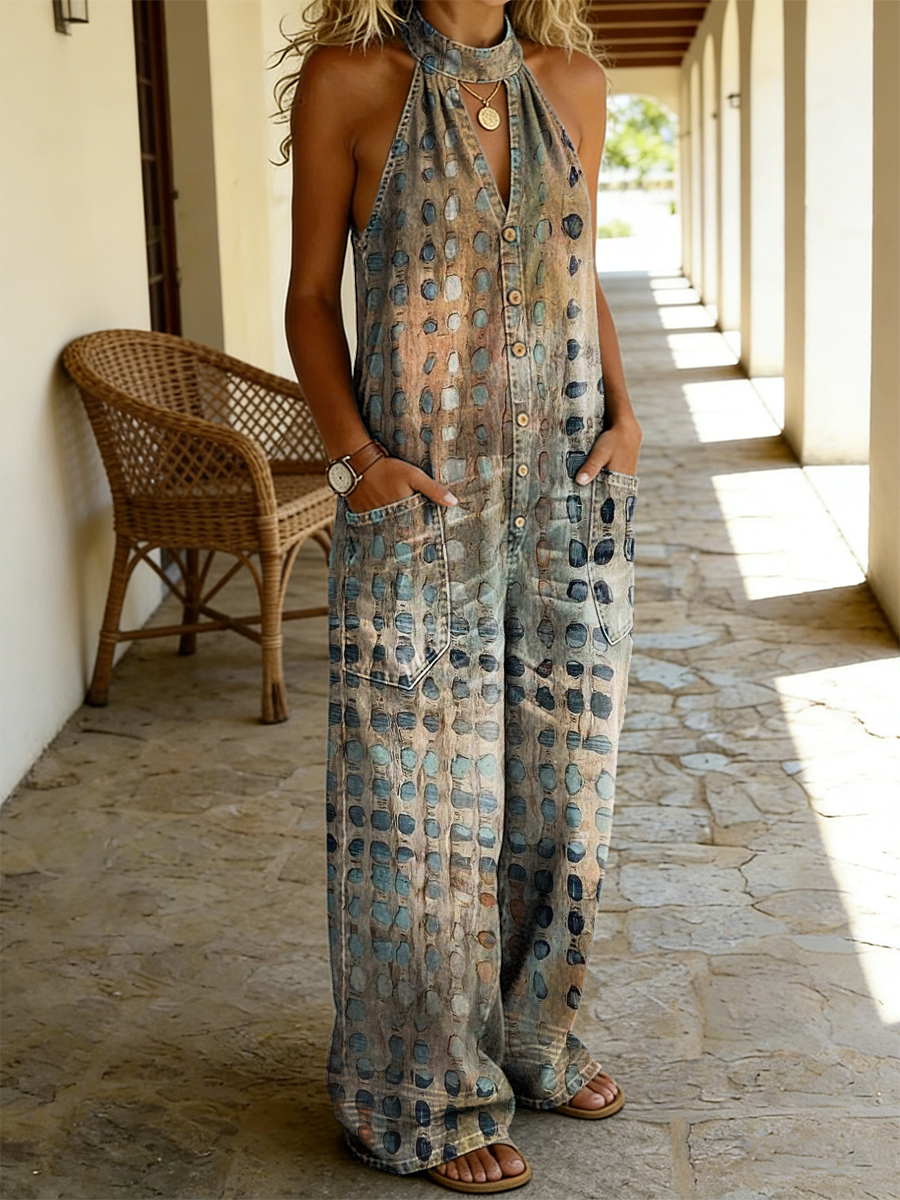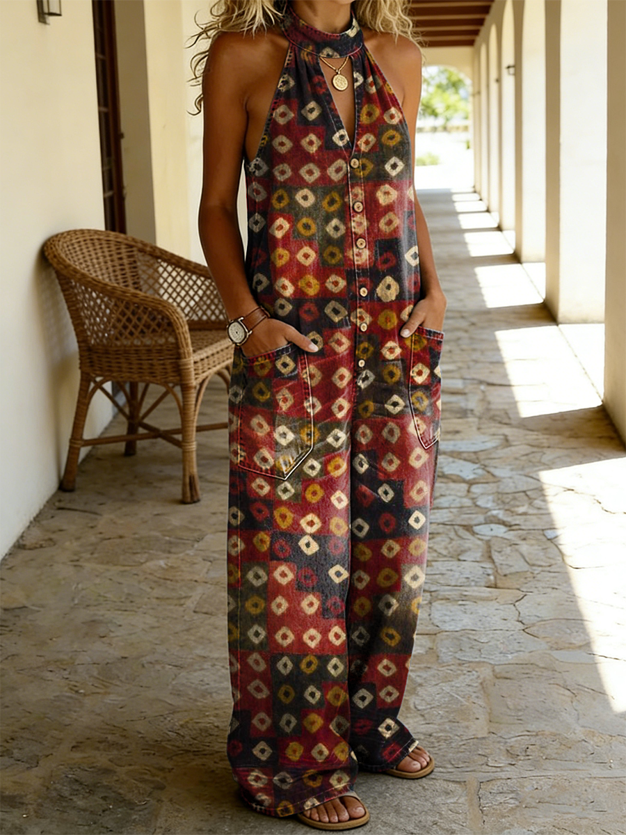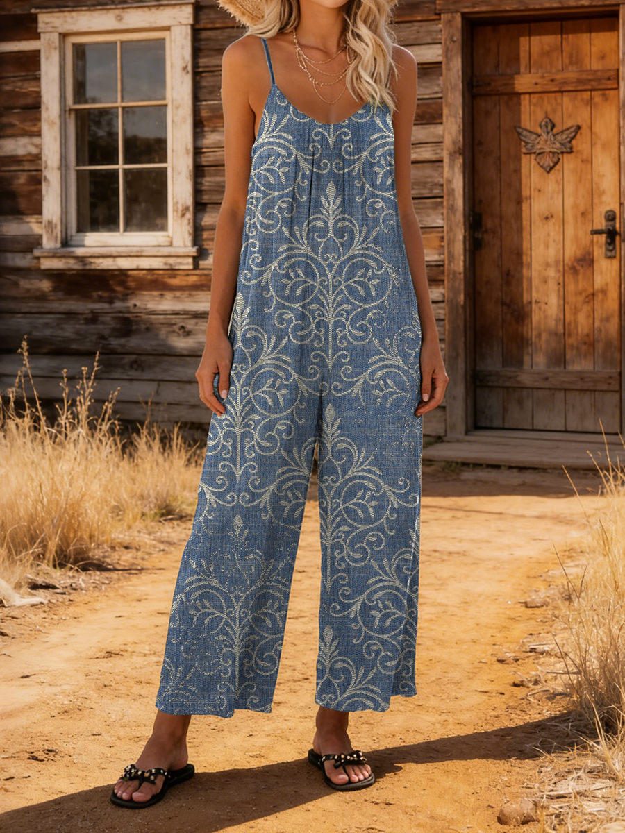 Women's Retro Bohemian Ethnic Floral Art Print Casual Sleeveless Pocket Jumpsuit