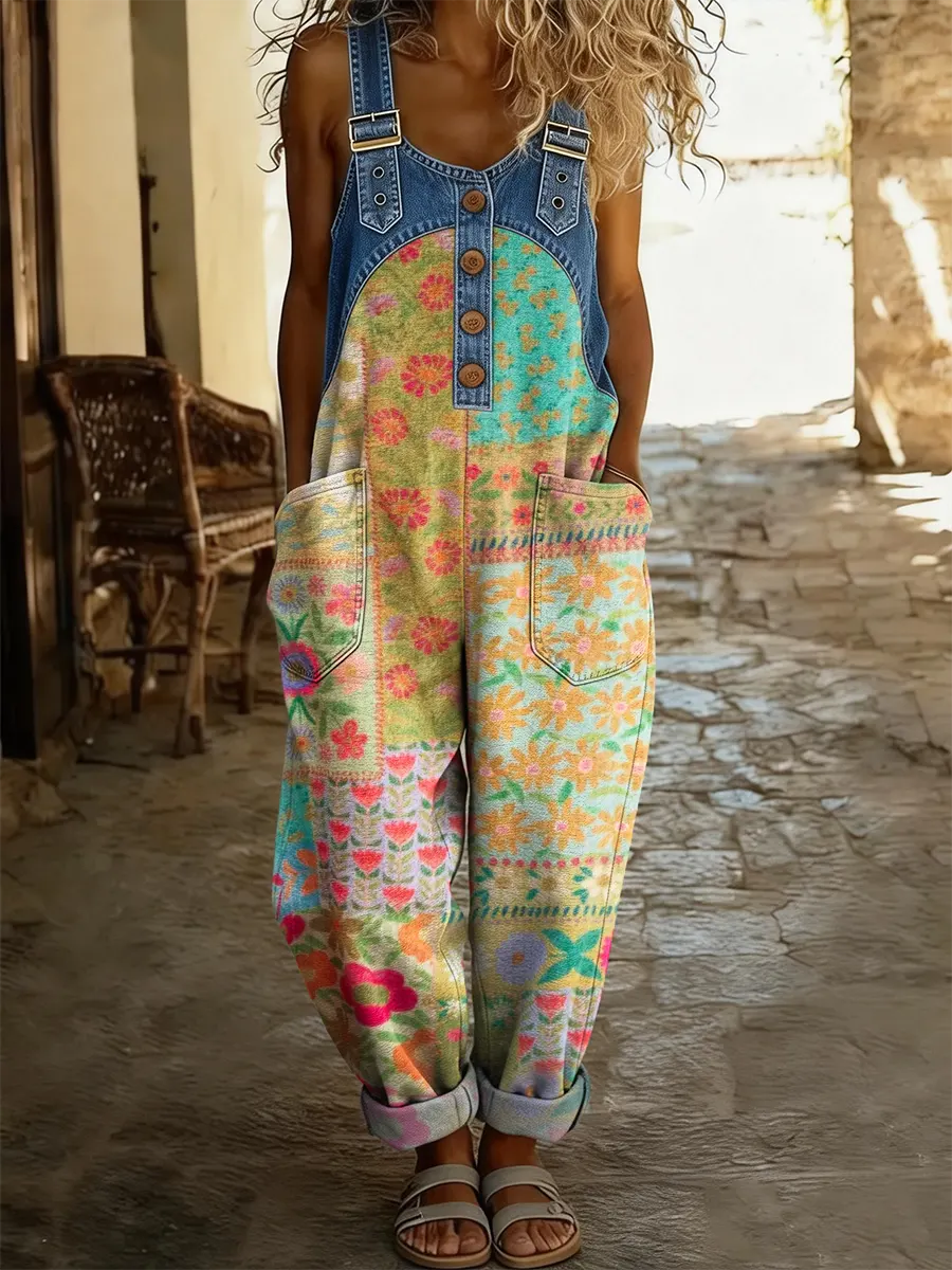 Ethnicity Floral Patchwork Women's Casual Washed Cotton Denim Patchwork Jumpsuit