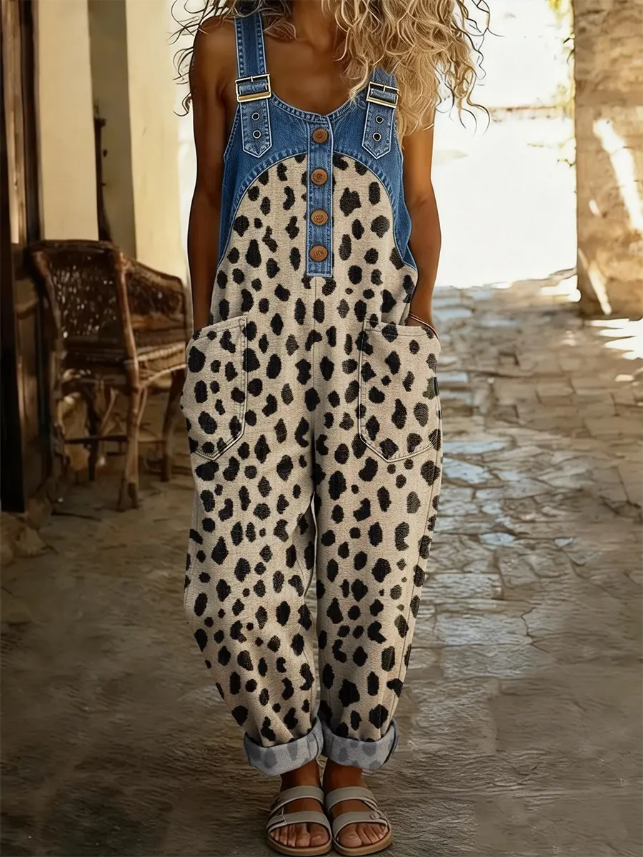 Ethnicity Leopard Print Pattern Women's Casual Washed Cotton Denim Patchwork Jumpsuit