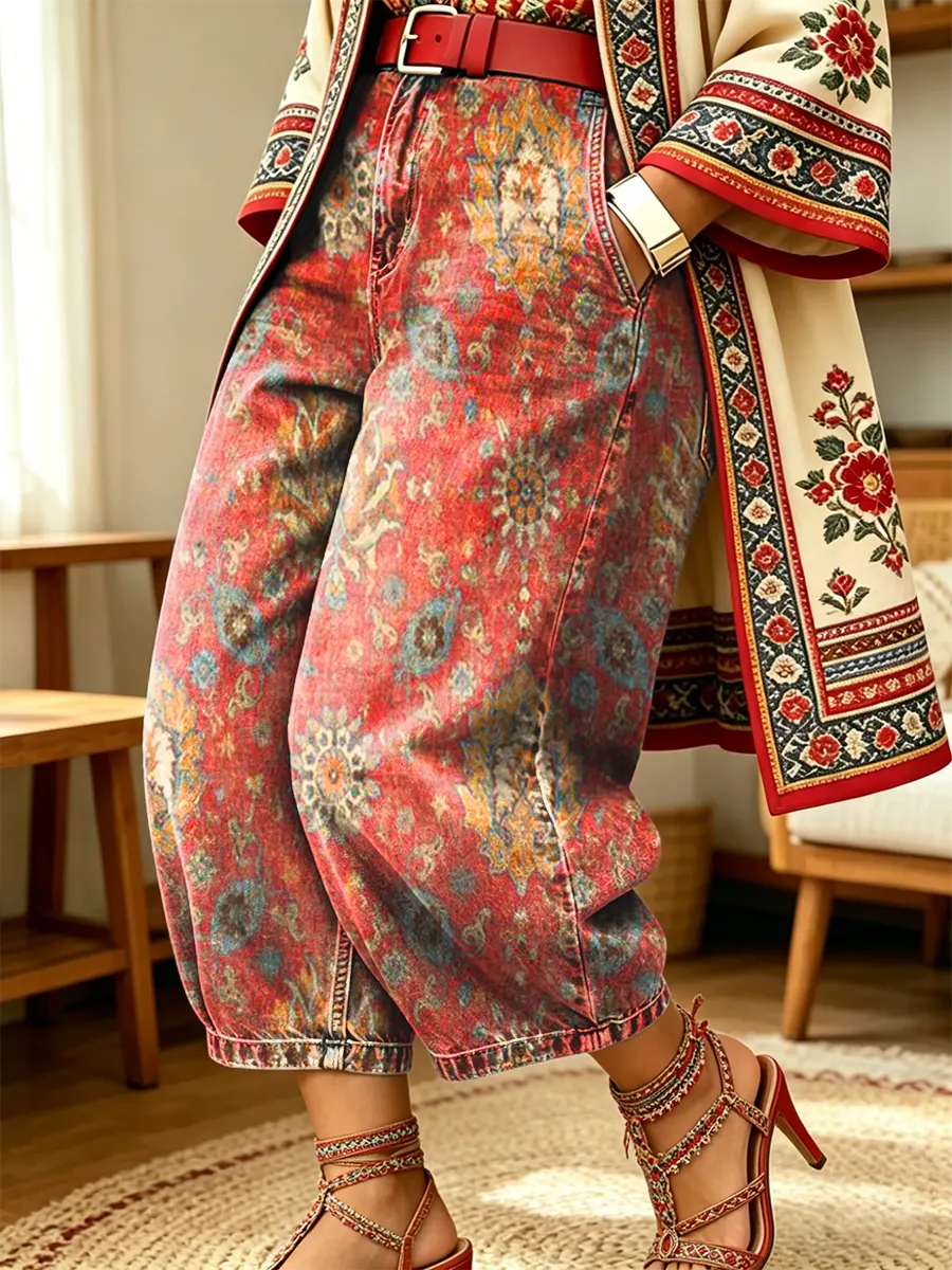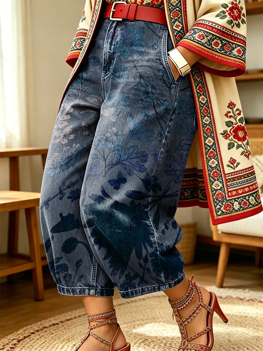 Ethnicity Bohemia Flowers Women's Art Pattern Print Casual Denim Cotton Pants
