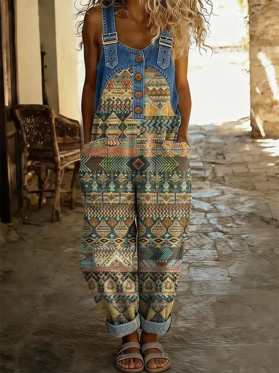 Ethnicity Geometry Totem Women's Casual Washed Cotton Denim Patchwork Jumpsuit