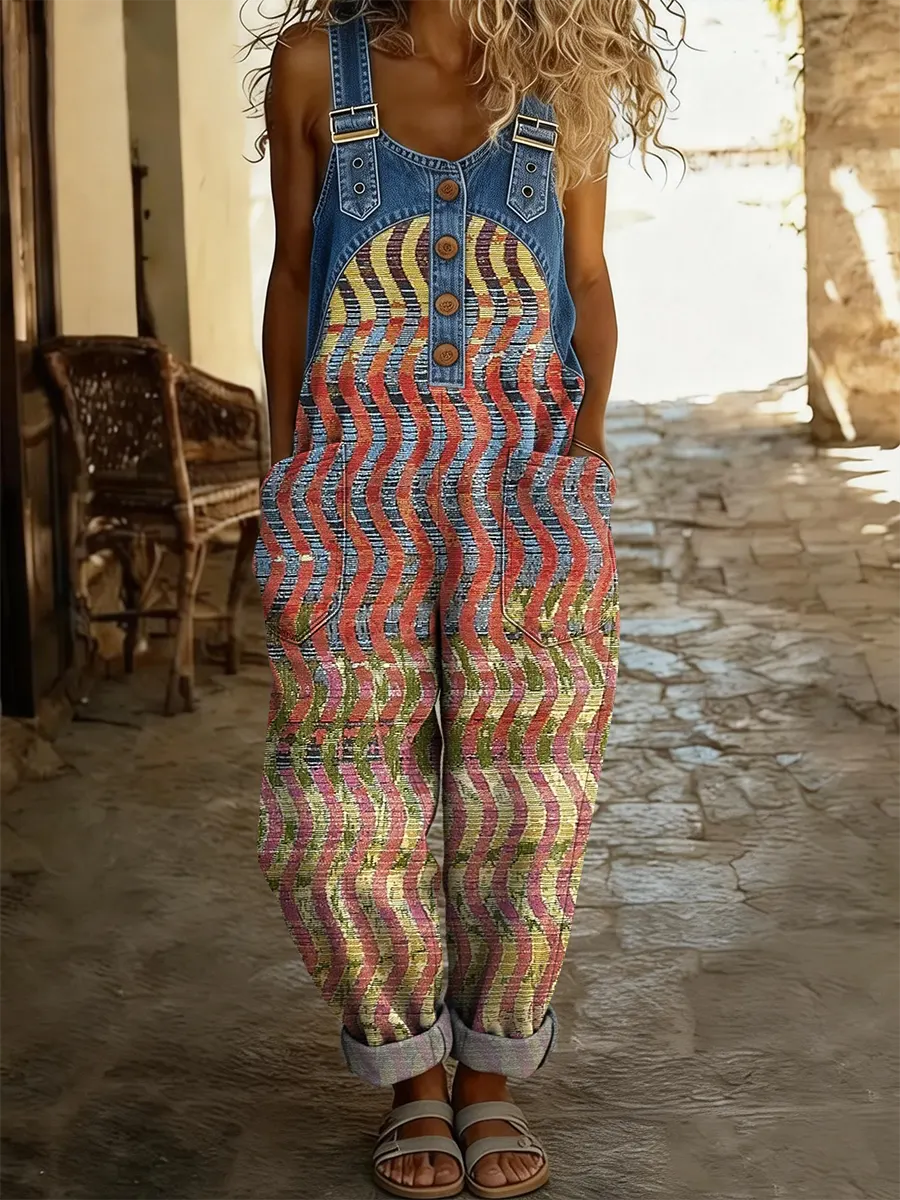 Ethnicity Geometry Arc Pattern Women's Casual Washed Cotton Denim Patchwork Jumpsuit