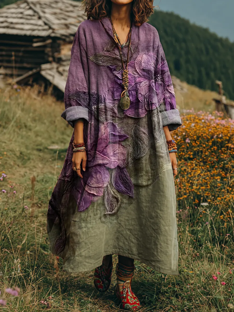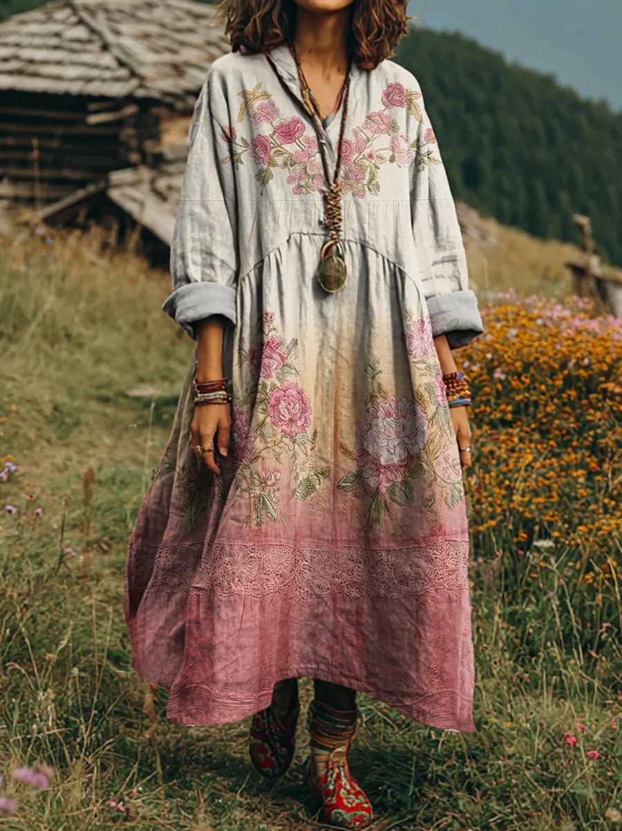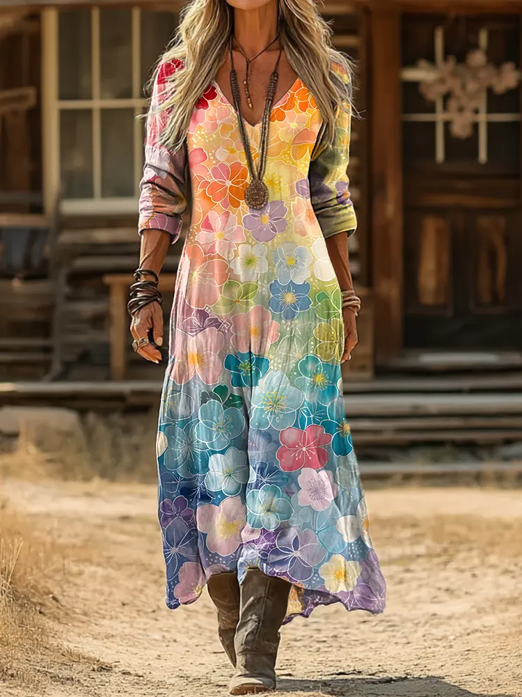 Ethnicity Bohemia Flowers Gradation Women's Art Print Casual Long Sleeve Dress