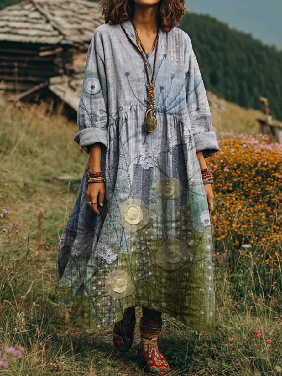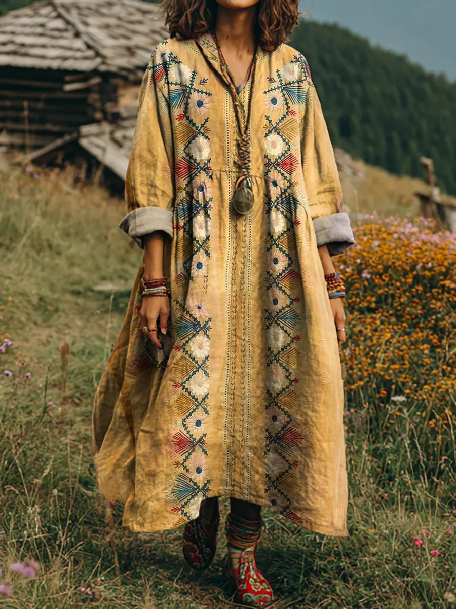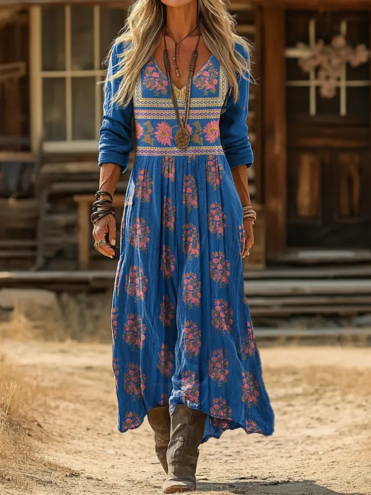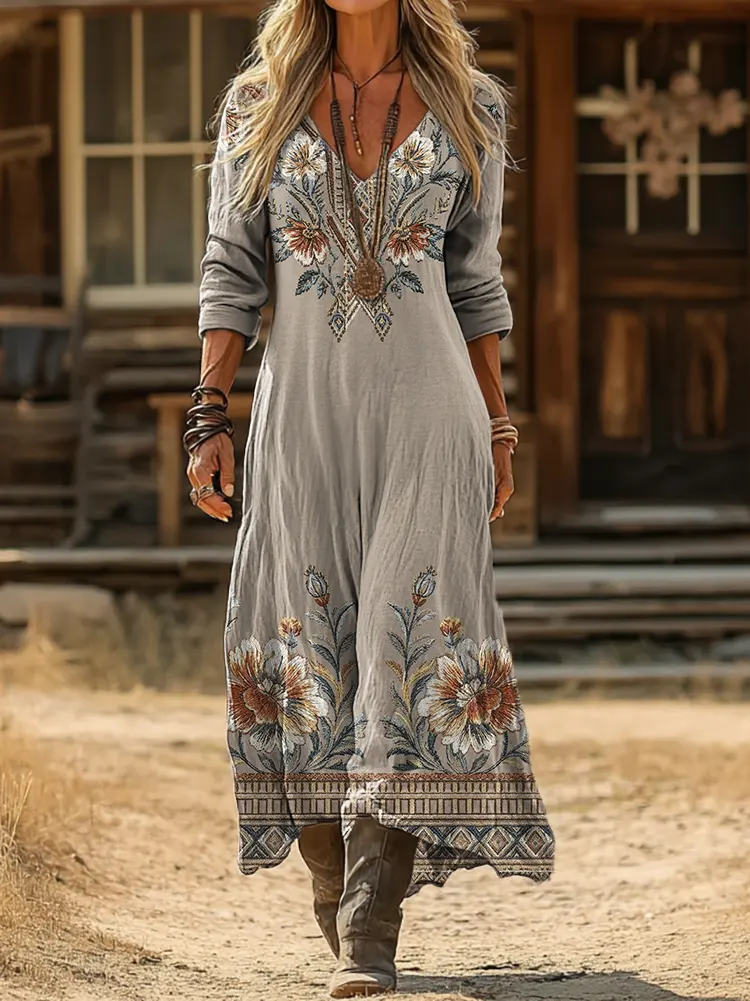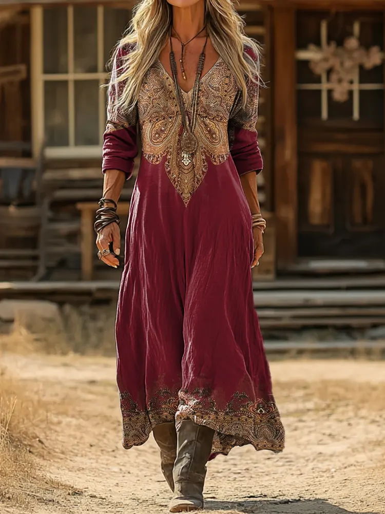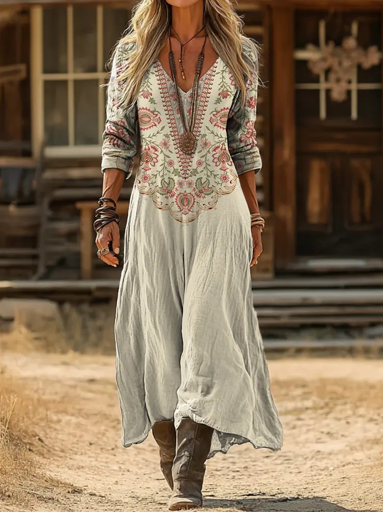 Women's Bohemian-style Long-sleeve V-neck Dress With Ethnic-inspired Artistic Print